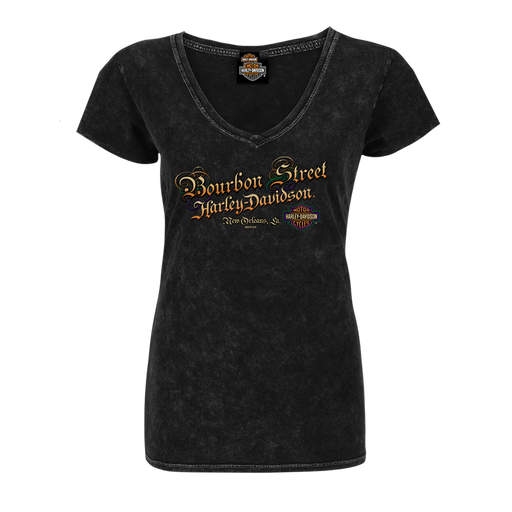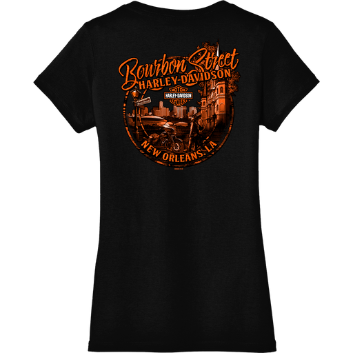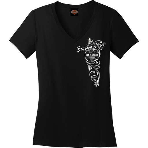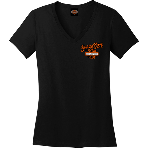 Bourbon Street Harley-Davidson Women's Short Sleeve V-Neck Shirt with Lady Rider design. 100% Cotton.
