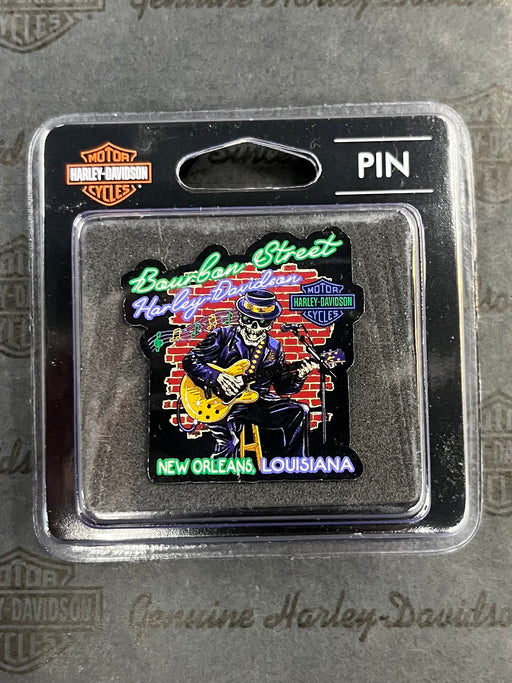 Bourbon Street Harley-Davidson Metal Pin with Skull Musician Design.